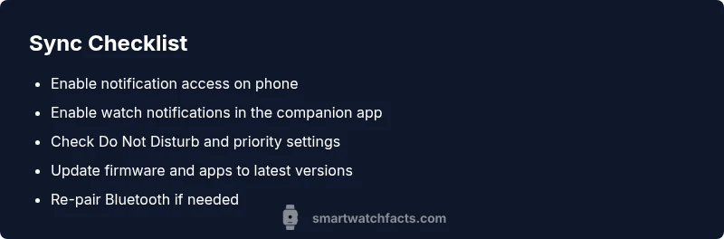 According to Smartwatch Facts, many users experience this issue because notifications fail to sync between the phone and the wearable. The problem is rarely caused by hardware and is often tied to software permissions, misconfigured notification settings, or a stale Bluetooth connection. Start by surveying the most frequent culprits: (1) notification access disabled on one or both devices; (2) Bluetooth pairing dropped or not established; (3) the messaging app not granted notification visibility on the watch; (4) Do Not Disturb or priority notification rules blocking alerts; (5) incompatible or outdated watch/phone firmware. By prioritizing these high-probability causes, you can fix most cases without an advanced reset. Keep in mind that carriers and apps vary, so you may need to tweak settings for each scenario. In Smartwatch Facts analysis, these issues account for the majority of missed-text problems across most Android-compatible wearables.