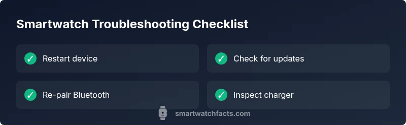 A practical mindset is to treat problems as signals rather than anomalies. If the watch is lagging, first check for a software update; if it won't pair with your phone, consider re-pairing and clearing old Bluetooth associations; if the battery drains quickly, review charging habits and power-hungry apps. By approaching issues with a structured plan, you can avoid unnecessary resets and data loss. The Smartwatch Facts team emphasizes that most problems are resolvable with built-in recovery options, careful data backup, and methodical testing of common culprits. We will expand on typical issue classes and provide concrete steps you can apply today to regain normal operation.