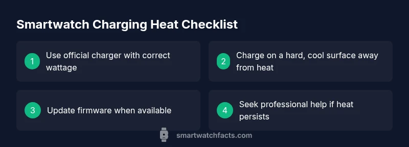 - Stop charging and cool down the watch for 10–15 minutes. 2) Switch to the original charger on a flat, hard surface away from heat sources. 3) Reconnect and monitor for 5–10 minutes; if no heat, proceed to update firmware. 4) Reboot the watch and check battery health in the settings. 5) If heat recurs, try a different outlet or charging pad. 6) If persistent, contact customer support for diagnostic or battery replacement guidance.