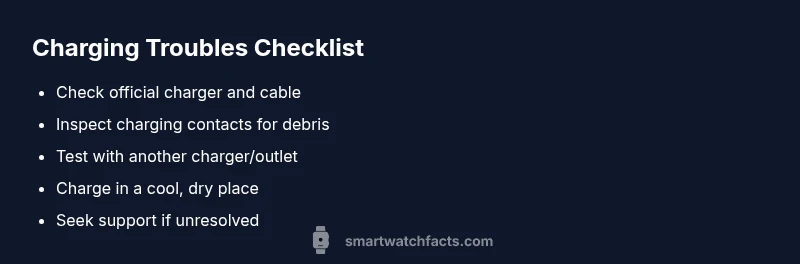 The diagnostic flow helps translate symptoms into concrete actions. Start with the simplest checks—cables, adapters, and port cleanliness. If charging doesn’t start, test with a different charger. If the problem persists, inspect for physical damage, moisture, or debris. When a single factor fails, apply the corresponding fix. If none of the basic fixes work, the issue could be deeper, requiring professional support. Smartwatch Facts recommends a methodical approach to avoid unnecessary replacements.