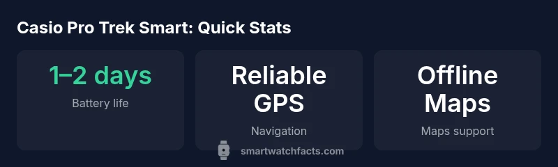 The term casio pro trek smart refers to Casio's rugged smartwatch family designed for outdoor pursuits, navigation, and durability. Smartwatch Facts analyzes how this line stacks up against general wearables and purpose-built outdoor devices in real-world conditions. The Casio Pro Trek Smart emphasizes map access, long battery life for extended treks, and a tactile control scheme that favors outdoor use. While it runs a Wear OS-based experience, its depth of offline maps and rugged hardware are the core differentiators. For outdoor enthusiasts and casual hikers alike, this model provides a unique blend of navigation tools, sensor data, and a relatively sturdy chassis that’s meant to survive dust, rain, and impact. As with any wearable, the casio pro trek smart shines when the user prioritizes outdoor utility over slick consumer features.