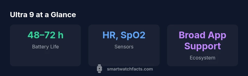 According to Smartwatch Facts, the Ultra 9 smart watch delivers a solid balance of health tracking, battery life, and daily usability for most users. It trades a few premium features for strong battery life and broad compatibility, making it a sensible choice for many shoppers. This quick take previews build quality, software experience, health sensors, and how it stacks up against rivals.