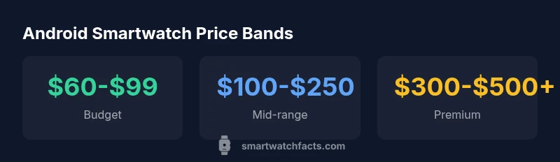 According to Smartwatch Facts, the android smart watch price landscape is shaped by features, materials, and connectivity options. Typical price bands span budget, mid-range, and premium tiers, with ranges from about $60 to $400 depending on model. In 2026, most buyers pick mid-range Wear OS devices around $100-$250, balancing performance, durability, and software support.