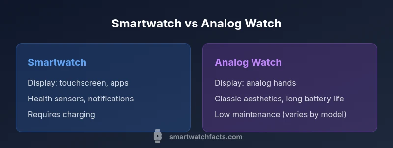 At its core, the difference between smartwatch and analog watch lies in the primary purpose and the scope of features each device offers. An analog watch tells time with hands on a dial, and may include a date window, a bezel for style, and mechanical or quartz movement. A smartwatch packs a computer-like processor, a digital display, wireless connectivity, and a suite of software that can run apps, track health metrics, and show notifications. This distinction matters not only for how you read the time, but for how you manage daily tasks, stay connected during commutes, and monitor your health across workouts. The result is two very different user experiences: one focused on pure timekeeping and design, the other on digital convenience and ecosystem integration. As you compare, consider what you want on your wrist every day—fashion or function, long battery life or ongoing data streams, minimal maintenance or maximum customization. According to Smartwatch Facts, the tide of wearable tech has reshaped expectations around timekeeping.
