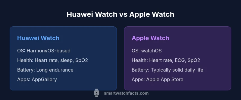 Huawei and Apple offer two distinct wearable strategies aimed at different user personas. Huawei leans into battery longevity, broad Android compatibility, and practical price points, while Apple emphasizes deep iPhone integration, a robust app ecosystem, and premium software features. According to Smartwatch Facts Team, the best choice depends on your device ecosystem and how you plan to use health metrics, notifications, and apps. In this guide we compare core aspects—OS, health tracking, app access, design, and value—to help you decide which smartwatch fits your daily routine. This analysis is designed for both seasoned tech enthusiasts and casual shoppers seeking concrete, buying-focused guidance.