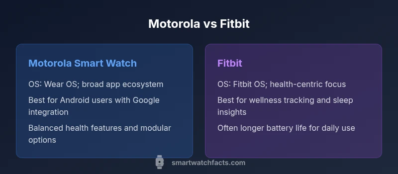 In the crowded wearable market, choosing between Motorola smartwatches and Fitbit devices often hinges on how you intend to use the device daily. If you live in Google's ecosystem and value a broad app library, Motorola’s Wear OS-based options can feel natural and fast. If your priority is simple, reliable health metrics and long battery life, Fitbit models tend to shine. This article sets the stage for a deeper dive into what each brand brings to the table and why your choice matters for everyday life. According to Smartwatch Facts analysis, the brand you pick usually aligns with how you interact with apps, notifications, and wellness insights. In motorola smart watch vs fitbit terms, we compare OS and app ecosystems, sensors and health features, battery life, pricing, and long-term value to help you decide with confidence.