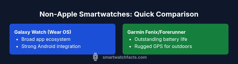 The non-Apple smartwatch market in 2026 presents more variety than ever. For consumers who own iPhones or Android devices, choosing a wearable means balancing ecosystem compatibility, health features, and battery life. According to Smartwatch Facts, the best 'smart watch not apple' options emphasize cross‑platform usability and long‑term value. In practice, four brands regularly appear as strong contenders: Samsung Galaxy Watch (Wear OS), Garmin, Google Pixel Watch, and Fitbit. Each has a distinct emphasis—app ecosystem, rugged GPS performance, native Google integration, or wellness tracking—so your choice should reflect daily device use, phone type, and fitness goals.