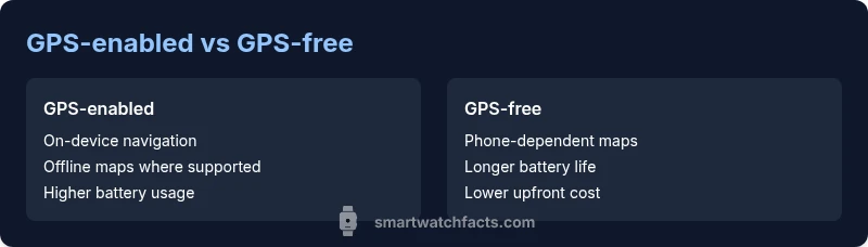 The main distinction is navigation capability. GPS-enabled watches determine your location directly from satellites, enabling on-device maps and route tracking. GPS-free models depend on a connected phone for navigation data, which can simplify hardware and extend battery life.