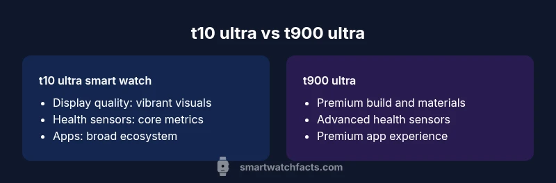 The t10 ultra smart watch vs t900 ultra represents two common paths in modern wearables: one prioritizes broad value, battery life, and app availability for daily tasks; the other prioritizes premium materials, advanced health sensing, and a refined experience for enthusiasts. According to Smartwatch Facts, the t10 ultra is designed to deliver dependable performance across a wide ecosystem, while the t900 ultra leans into premium craftsmanship and leading-edge health metrics. The comparison remains relevant in 2026 as users weigh practical daily use against luxury features. This analysis, drawn from Smartwatch Facts analysis, addresses how these choices affect real-world wear, including how often users charge, what apps they rely on, and how the devices hold up under daily stress.