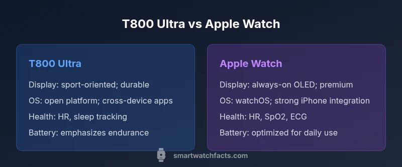 Quick take: In the t800 ultra smart watch vs apple watch comparison, Apple Watch typically leads for iPhone users thanks to a mature app ecosystem and seamless cross-device integration. The t800 Ultra offers solid fitness tracking and a lower price. If you’re deeply invested in Apple services, choose the Apple Watch; if budget and broad compatibility matter most, the t800 Ultra is a compelling alternative.