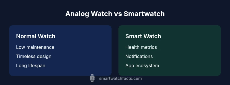 For readers exploring the question what are the advantages of a normal watch compared to a smart watch, it's important to start from a foundation of timekeeping philosophy. Traditional or "normal" watches emphasize elapsed time through mechanical or quartz movements, with minimal digital dependency. They are valued for reliability, longevity, and a design language that transcends software cycles. According to Smartwatch Facts, traditional analog watches excel in durability and timeless aesthetics, offering a dependable companion that seldom distracts you from tasks. The Smartwatch Facts team found that many wearers appreciate the absence of screens, notifications, and battery drains that can accompany digital devices. For those who want a wearable that simply tells time, carries stories through craft, and retains value with or without updates, the advantages are clear: fewer maintenance surprises, fewer software risks, and a broader range of formal and casual styling options. When you weigh practicality against technological novelty, the traditional watch often comes out ahead in contexts where reliability and discretion matter most.