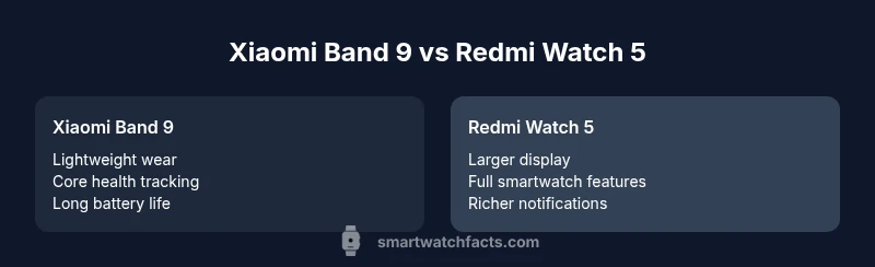 In the wearable space, the Xiaomi Band 9 and Redmi Watch 5 occupy different corners of the market. The Band 9 emphasizes a compact, lightweight form factor and long all-day comfort, ideal for day-long wear and fitness basics. The Redmi Watch 5 targets users who want a more feature-rich smartwatch experience, with a larger display and broader notification support. According to Smartwatch Facts analysis, the main trade-off between these two devices is battery life versus display real estate and app-like features. The Smartwatch Facts team found that most shoppers decide based on how much they value screen size and smartphone connectivity on the wrist. This article delivers a practical, data-informed look at design, health tracking, software, and value to help you decide which wearable should be your daily companion in 2026.