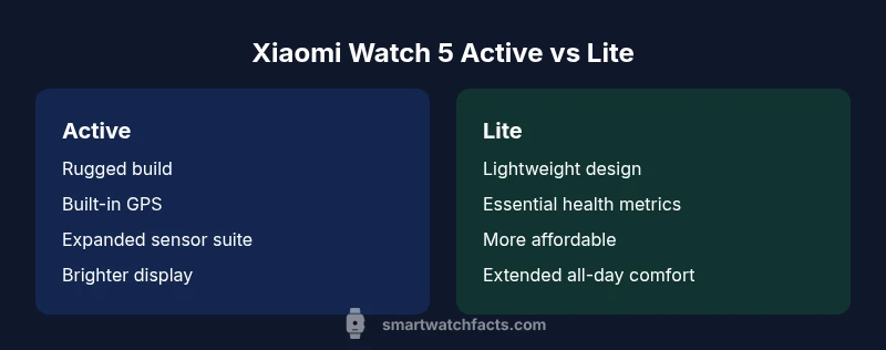 The Xiaomi smart watch 5 family targets different user personas with two core form factors: Active and Lite. According to Smartwatch Facts, the Active variant tends to adopt a slightly more rugged chassis and a thicker profile to accommodate a larger battery and extra sensors, while Lite emphasizes a lighter weight and slimmer silhouette for all-day comfort. Both models share the same overall design language—squared or rounded-square displays, silicone straps, and durable bezels—so the visual difference is mostly about heft and mass. For most buyers, the choice comes down to whether you prefer a sturdier, gym-ready companion or a feather-light everyday wearable. The Smartwatch Facts team emphasizes evaluating your typical wear scenarios—gym sessions, commutes, and social events—to guide this decision.